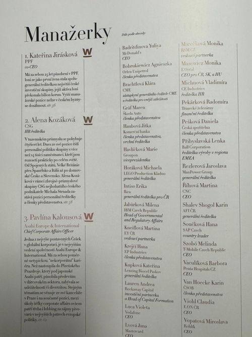 Kategorii Manažerka ovládla Kateřina Jirásková, která se jako první žena stala spolugenerální ředitelkou investiční skupiny PPF Group. Skupina přitom loni překonala hranici jednoho bilionu korun v aktivech, což podtrhuje význam její role v českém byznysu.